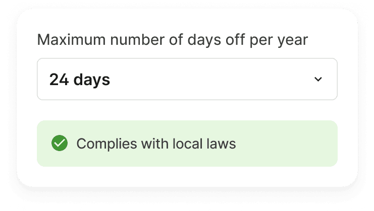 Tracking local labor laws and regulations across a distributed workforce is time consuming, and prone to costly errors. Let us handle it instead. With local compliance built into our HR software—from mandatory PTO and minimum wage to benefits and termination requirements—Deel can keep you compliant in 150 countries, effortlessly.